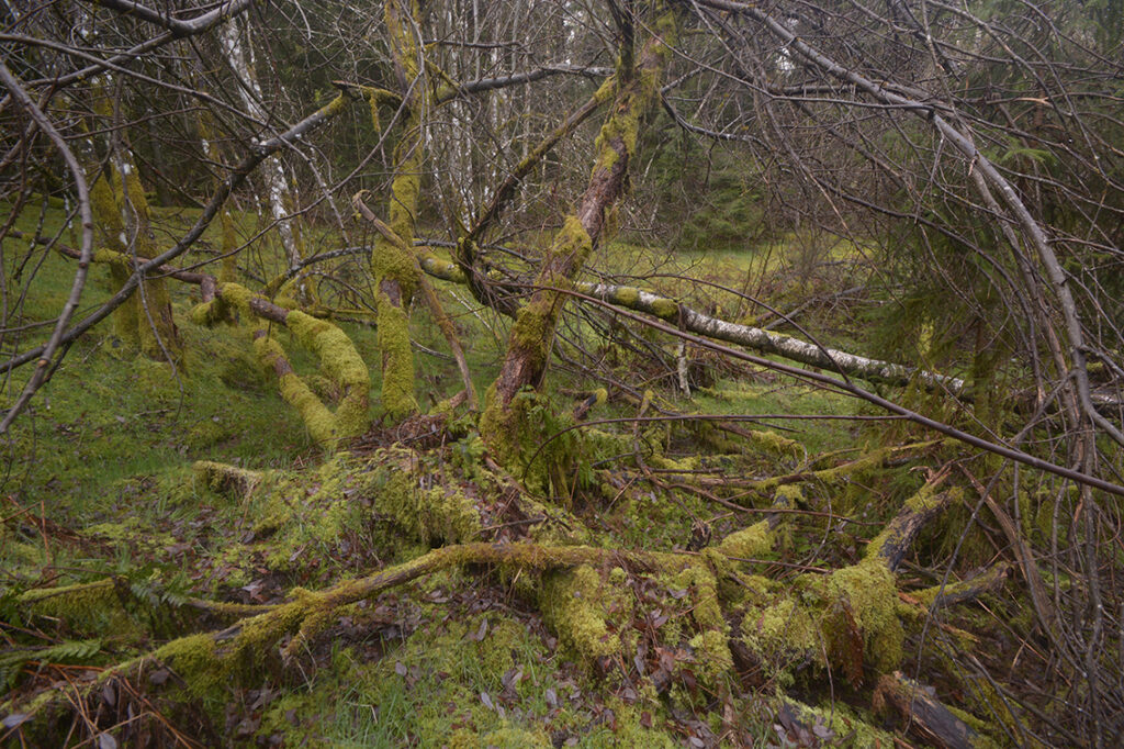 Dans ce sanctuaire de verdure, les arbres chuchotent, leurs branches fines tendues comme des antennes vers le ciel, leurs troncs recouverts de mousses éclatantes, mémoire du temps.